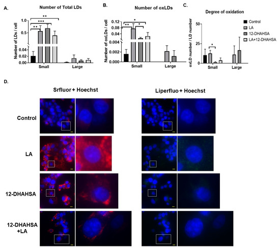 Furthermore, the antioxidant potential of 12-DHAHSA was evaluated by the fluorescent imaging technique. The 12-DHAHSA was selected because of its lower cytotoxicity compared to 12-DHAHOA. The lipid droplets (LDs) were induced by treatment of C3A cells with linoleic acid (LA) for 8 h and the effects of 12-DHAHSA on total and oxidized lipid droplets (oxLDs) were determined by the method established earlier in our laboratory [16]. There is a significant increase in the total number of LDs observed between the control and LA or 12-DHAHSA treated group (Figure 6A). However, a slightly decreasing trend is observed in total LDs with LA and the 12-DHAHSA treated group. Furthermore, the number of small oxLDs decreased with 12-DHAHSA treatment compared to LA treated group (Figure 6B). However, no significant changes were observed for large oxLDs. The degree of oxidation in small LDs was also decreased with 12-DHAHSA treatment. The fluorescent images showed the effect of 12-DHAHSA on LDs (SRfluor + Hoechst) and oxLDs (Liperfluo + Hoechst) are shown in Figure 6C.