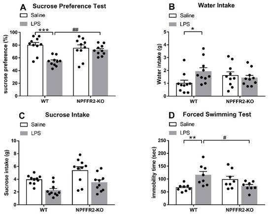Two groups of mice (WT and NPFFR2-KO) were treated with saline or LPS (1 mg/kg; intraperitoneal, i.p.) 24 h prior to evaluation in the SPT or FST. Decreases in sucrose preference and increases in immobility time were evident in LPS-treated WT mice, but no such effects were observed in NPFFR2-KO mice.