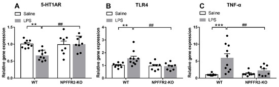 To test our hypothesis that NPFFR2 may play a role in mediating LPS-induced 5-HT1AR downregulation and inflammation-related responses in the ventral hippocampus, the mRNA levels of 5-HT1AR, TLR4 and tumor necrosis factor-α (TNF-α) were assessed by real-time PCR. The ventral hippocampal 5-HT1AR mRNA level was decreased in LPS-treated WT mice, while TLR4 and TNF-α mRNA levels were increased. In contrast, the mRNA levels of ventral hippocampal 5-HT1AR, TLR4 and TNF-α in NPFFR2-KO mice treated with LPS remained unaltered when compared to saline control.