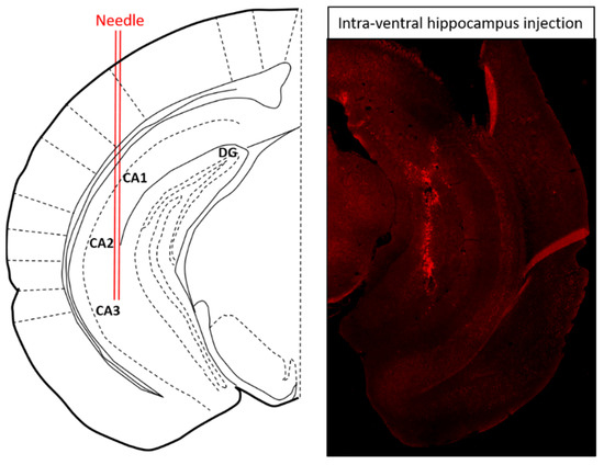 Schematic diagram and representative brain section illustrating the site of intra-ventral hippocampal injection. Seven days after ventral hippocampal injection with adeno-associated virus encoding green fluorescent protein, the mouse was perfused and the brain was fixed by 4% paraformaldehyde and cryosectioned to 25 μm. The injection site for ventral hippocampus was: AP, −3.10 mm; ML, ±3.00 mm and DV, −4.00 mm to bregma [47].