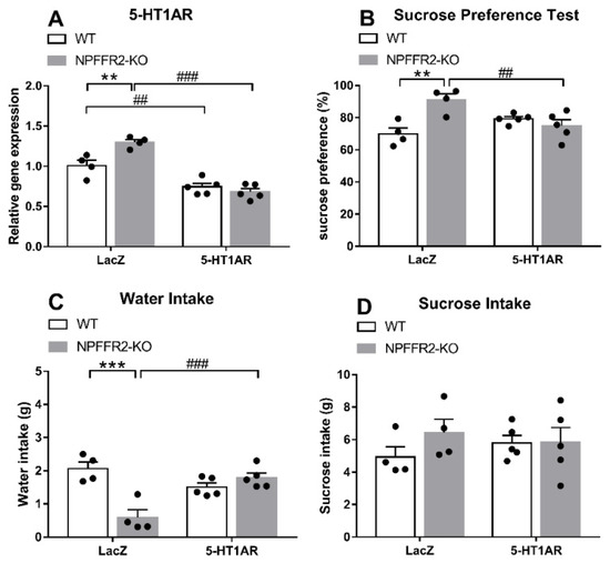 Many lines of evidence support the idea that downregulated hippocampal 5-HT1A heteroreceptor is one of the most relevant biological predictors for the development of depressive-like behaviors and the efficacy of certain antidepressants [11,17,57,58]. Decreases in hippocampal 5-HT1AR have been correlated with the magnitude of depressive-like behavior [59], and the anti-depressant effect of fluoxetine is abolished in mice lacking 5-HT1AR in mature dentate gyrus granule cells [60]. Consistent with these findings, we found that a single dose of LPS provoked depressive-like behaviors and caused a decrease of 5-HT1AR mRNA levels in the ventral hippocampus of WT mice. Moreover, silencing of ventral hippocampal 5-HT1AR with shRNA induced anhedonia (indexed by sucrose preference decline) in the LPS-treated NPFFR2-KO mice. Intriguingly, silencing of ventral hippocampal 5-HT1AR did not affect anhedonia in WT mice. These puzzling findings could be explained by a so-called floor effect of silencing 5-HT1AR mRNA on sucrose preference in LPS-treated WT mice. This potential explanation is especially compelling, considering the fact that LPS-treated WT mice pretreated with LacZ shRNA had the lowest sucrose preference among the four experimental groups. Another possible explanation could be related to the fact that we used exclusively female mice as experimental animals. Sex differences are clearly observed in inflammation-related depression [61]. Female rats display milder depressive-like phenotypes than male rats after LPS administration [62]. Accordingly, the sex-specific effects of ventral hippocampal 5-HT1AR on LPS-provoked depressive-like phenotypes are unknown, and the topic merits further study. The mechanism underlying crosstalk between NPFFR2 and 5-HT1AR signaling is another question raised by our results, and it too warrants further study. It was of interest to note that following LPS treatment, LacZ-shRNA-treated NPFFR2-KO mice seemed to display less water intake than LacZ-shRNA-treated WT mice (Figure 4C), while such effect was marginal in NPFFR2-KO vs. WT mice treated with LPS (Figure 1B). Nonetheless, LPS-treated WT mice in these two experiments demonstrated comparable water intakes (approximately 2 g), regardless of intra-ventral hippocampal infusion with LacZ-shRNA. Moreover, LPS-treated NPFFR2-KO mice exhibited slightly higher sucrose, while lower water, intake as compared to the LPS-treated WT mice across two experiments. Therefore, intra-ventral hippocampal LacZ-shRNA infusion, at best, minor affect mice’ fluid intake motivation and/or behavior.