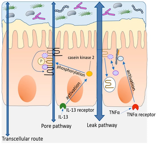Molecules can pass through the epithelium passively via transcellular route [26,33] or paracellular route [26,34] (Figure 3). Soluble lipids, small hydrophilic compounds, ions, and water molecules pass through the transcellular route. The paracellular route allows the passage of bigger molecules, although the size is limited at up to 600 Da in in vivo and 10 kDa in in vitro [35,36] via apical junctional complex. The latter route is further divided into two types of pathways and regulated by IL-13 and tumor necrosis factor (TNF). IL-13 specifically increases flux across the small molecules, including ions and water, through the pore pathway [37]. IL-13 causes barrier loss by inducing claudin-2 expression as well as by increasing apoptosis and inhibiting wound healing both in vitro and in vivo, whereas lower doses of IL-13 induce claudin-2 upregulation and claudin-2-dependent pore-pathway activation in response to IL-13 exposure without increase in leaks or unrestricted pathway flux [37,38]. TNF opens the leak pathway via myosin light chain kinase (MLCK) and lets bigger molecules pass through the intracellular space [37]. Hence, the leak pathway is likely to be associated with inflammation, which would permit the passage of macromolecules, bacterial products, and food antigens. TNFα has also been shown to regulate TJ and the clinically relevant role of TNF in IBD pathogenesis is clearly demonstrated by the efficacy of anti-TNF antibodies in IBD, which reduces disease severity and restores intestinal barrier function [39]. Restoration of epithelial barrier function by anti-TNF therapy may reflect mucosal healing in the setting of a dampened immune system; however, pre-clinical studies have shown that TNF signaling also modulates TJ. Many studies have shown decreased levels of intestinal TJ-consisting proteins in animal models of IBD [40], obesity, and T2D [41,42], with increased permeability, suggesting that a leaky pathway is responsible for LGS.