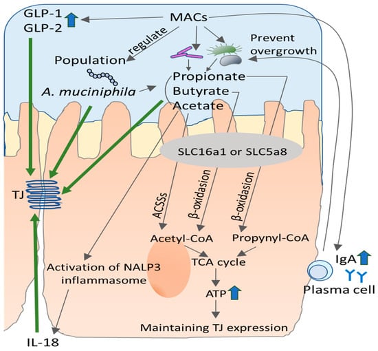 Effects of microbiota-accessible carbohydrates (MACs) on tight junction (TJ). Intestinal bacteria digest fermentable MACs and produce short-chain fatty acids (SFCA) which are absorbed into epithelial cells via solute carrier family (SLC) transporter or simple diffusion. Acetate, butyrate, and propionate are converted to acetyl-CoA or propynyl-CoA via acetyl-CoA carboxylases (ACSSs) or β-oxidation to produce ATP which maintain cell homeostasis including the function of TJ. Acetate activates nucleotide-binding oligomerization domain 3 (NLRP3) and promotes the secretion of IL-18 from epithelial cells, which contributes to TJ function. Other SCFA also have a protective effect on TJ. MACs also may contribute to TJ function via regulating the growth of Akkermansia muciniphilla (A. muciniphilla) or the production of Glucagon-Like Peptide (GLP) 1 and GLP-2.