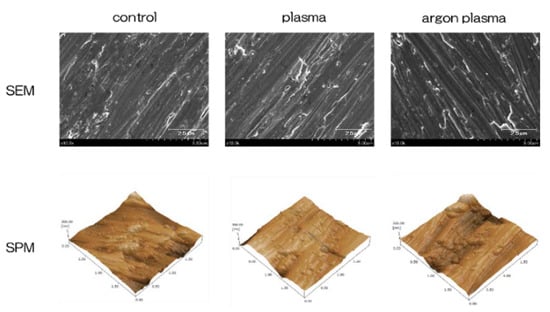 Scanning electron microscopy (SEM) and scanning probe microscopy (SPM) observations show no structural changes on the titanium surface after plasma and argon plasma treatment.