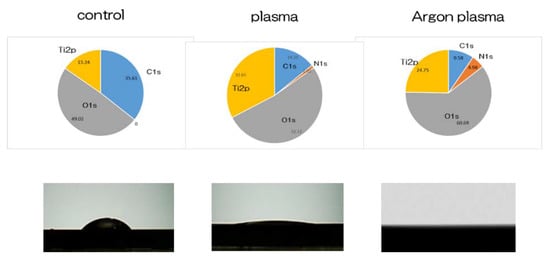Based on the results of the X-ray photoelectron spectroscopy (XPS) analysis, an increase in the O2 peak on the titanium surface was observed due to plasma treatment. In contrast, the C1s peak height on the titanium surface was decreased due to the plasma treatment. The C1s peak showed the lowest value in the argon plasma-modified group. It was clarified that the contact angle of the material surface was reduced due to plasma treatment; this was the lowest value in the argon plasma-modified group. The untreated group showed 62°, the plasma-treated group showed 8°, the argon gas group showed 0°, and the argon gas group showed the lowest value.