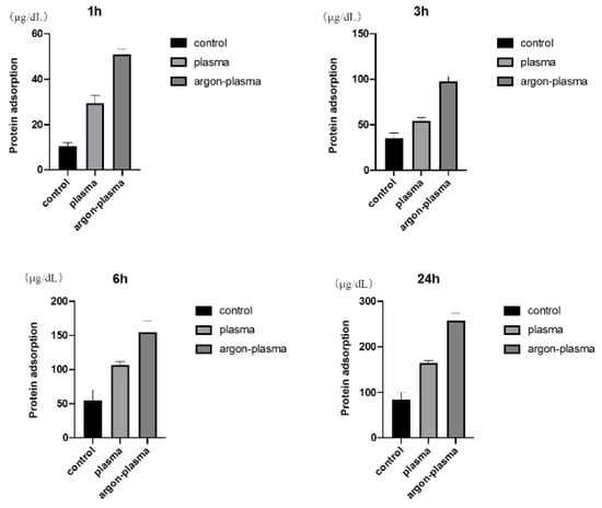 The results of the adhesion examination of BSA among the three groups are shown. The BSA adsorption was significantly higher in the test group than in the control group. In addition, the highest value was observed in the group modified with argon plasma.