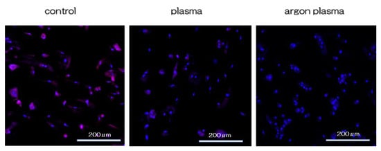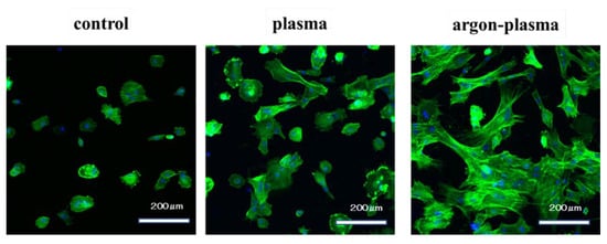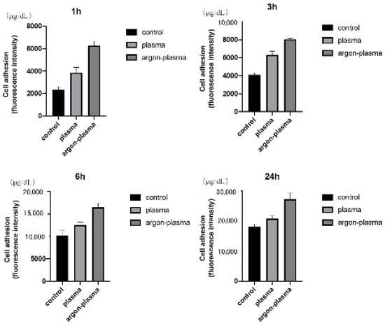 The morphology of RBMCs on the titanium surface after 6 h of culture was observed using a fluorescence microscope. It was confirmed that the RBMCs adhered to the surface of the materials for all three groups (Figure 4). After argon-plasma treatment on the material surface, the number of adhered RBMCs was statistically significantly higher than that in the control group. In addition, the highest value was observed in the argon plasma treatment group, among all three groups. At all measurement time points, the adhesion number of RBMCs in the argon plasma-treated group was the highest, significantly, among all three groups (Figure 5).