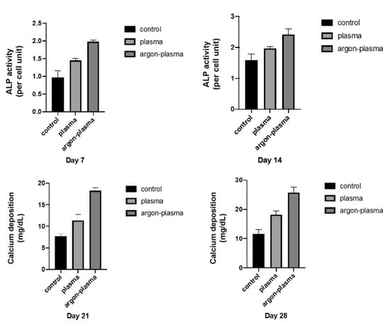 Alkaline phosphatase (ALP) expression in bone marrow cells at days 7 and 14, after the start of culture, was significantly higher on the material surface of the argon plasma-treated group, among all three groups. The amount of calcium deposited on the material surface at days 21 and 28 after the culture incubation, was significantly the highest for the argon plasma-treated group, among all three groups.