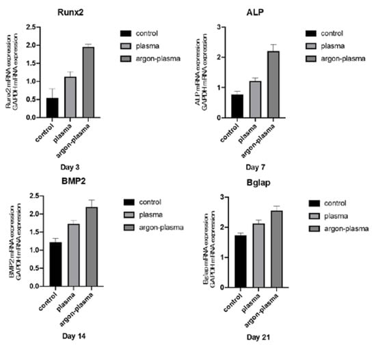 The gene expression related to the induction of hard tissue differentiation on the material surface of the samples in the test and control groups were analyzed. In this experiment, the assay was performed at a measurement time specific to each gene. Significantly higher gene expression was observed on the material surface of the samples in the argon plasma-treated group, among all three groups, at all measurement time points.