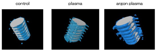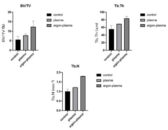 Furthermore, the ratio of bone mass to total mass (BV/TV), average trabecular number (Tb.N), and average trabecular thickness (Tb.Th), were the highest, significantly, for the material surface of the argon plasma-treated group, among all three groups. The implants promoted osteogenic activity (p < 0.05).