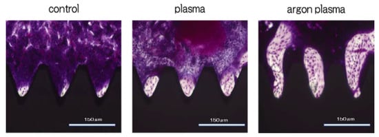 In the in vivo evaluation of this study, the femur of a rat was used, and the implanted material was in direct contact with the sea surface bone, assuming an actual dental clinic. In a rat model, healing 8 weeks after transplantation is considered the final stage of wound healing because it allows bone marrow cells to contact the surface of the implanted implant material [,]. This is the key to osseointegration. The above-mentioned in vitro evaluation revealed that the surface of the pure titanium metal in the argon plasma treatment group showed the highest initial adhesion ability of bone marrow cells. In other words, it is clear that our in vivo analysis results correlate with the in vitro evaluation. In this study, the results of micro-CT and histopathological diagnosis showed an increase in BIC, BV/TV, and Tb.Th values, and a decrease in Tb.Sp around the argon-plasma-treated implants. Therefore, the surface of the implant material subjected to argon plasma surface control significantly increases the adsorption of protein due to the superhydrophilicity of the material surface, and the bone contact rate is increased by contacting the surface bone of the rat femur. It was revealed that there was a significant increase. However, a strong evidence has not been obtained yet, and it should be investigated in the future studies.