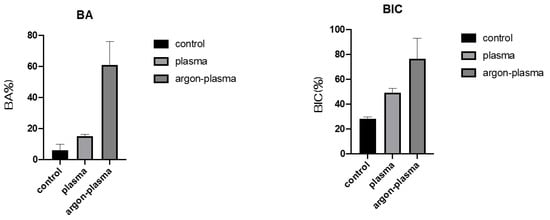 Furthermore, the amount of new bone formation was confirmed based on the longitudinal sections. As shown in Figure 11, a greater amount of newly formed bone was observed around the implants in the argon plasma-treated group, among all three groups. Quantitatively, histomorphometric analysis showed that the bone area ratio (BA) and bone-to-implant contact (BIC) on the material surface were significantly the highest for the argon plasma-treated group, among all three groups (Figure 12).