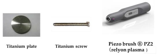 This study was designed to evaluate the effect of argon-based atmospheric pressure plasma treatment on hard tissue formation on titanium surfaces. The experimental group was divided into three groups: argon-based atmospheric pressure plasma-treated group, atmospheric pressure plasma-treated group, and untreated group. Titanium samples (JIS Grade 2, 15 mm in diameter, and 1 mm-thick titanium, Daido Steel, Osaka, Japan) and titanium screw implants (1.2 mm in external diameter and 12 mm in length, Daido Steel) were used in this study for in vitro and in vivo analysis, respectively (Figure 13). The disks and screw implants were ultrasonically rinsed in acetone, ethanol, and distilled water for 10 min each, and air-dried. The plasma treatments on the titanium surface were performed using a piezobrush® PZ2 (Relyon Plazma GmbH, Regensburg, Germany). The plasma treatment was performed using an active gas under atmospheric pressure; the low-temperature plasma treatment was conducted under irradiation at 0.2 MPa for 30 s at 10 mm, and the argon-based atmospheric pressure plasma treatment was performed under irradiation at 0.1 MPa for 30 s at 10 mm.