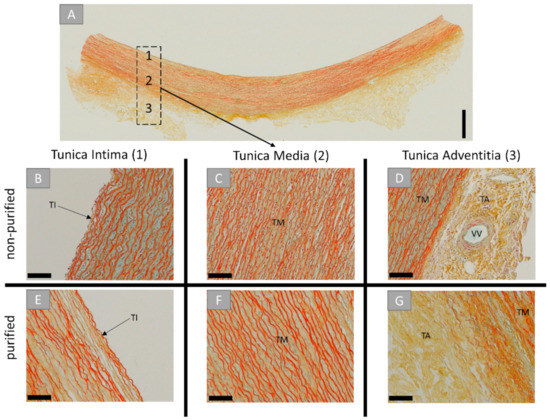 Figure 1. (A) Cross-sectional overview and detail microscopic images prior (BD) and after decellularization (EG) of the porcine aorta. TI: tunica intima, TM: tunica media, TA: tunica adventitia, VV: vasa vasorum. (Movat pentachrome stainings, (A) “total scan”, scalebar = 1 mm, (BF) 20× magnifications, scale bars = 100 µm).