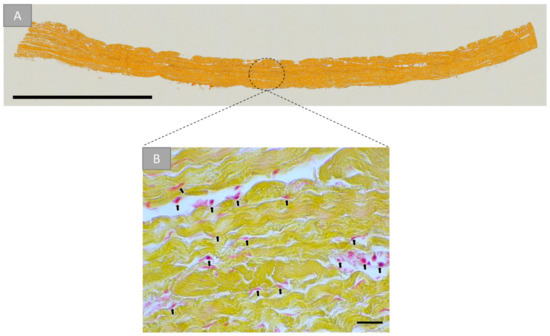 Figure 2. (A) Cross-sectional overview and detail microscopic image (B) of the purified bovine pericardial tissue. Arrows: remaining donor cells (Movat pentachrome stainings, (A) “total scan, scalebar = 2 mm, (B) 40× magnifications, scale bars = 20 µm).