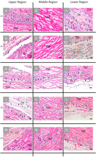 At day 120 post implantationem, the manifestation of the inflammatory tissue reaction was visibly lower compared to the former study time points (Figure 4M–O). Still, mainly macrophages, fibroblasts, and eosinophils, besides a few MNGCs, were involved in the tissue reactions to the former tunica intima and tunica adventitia (Figure 4M,O). The tunica media was highly infiltrated by eosinophils, lymphocytes, fibroblasts, and macrophages in concert with blood vessels and single MNGCs (Figure 4N).