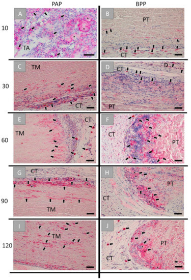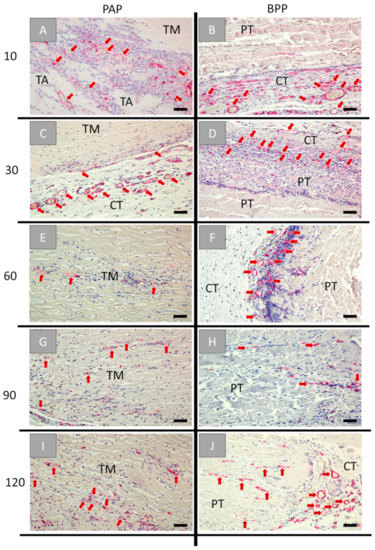 Figure 7. Histological images of the immunohistochemical CD31-detection within the implantation beds of the porcine aorta patch (PAP, left row) and the bovine vessel patch (BPP, right row) at (A,B) day 10, (C,D) day 30, (E,F) day 60, (G,H) day 90, and (I,J) day 120 post implantationem within the subcutaneous connective tissue (CT). Red arrows: blood vessels, TA: tunica adventitia, TM: tunica media, PT: pericardial tissue (Immunohistochemical CD31-stainings, 20× magnifications, scale bars = 50 µm).