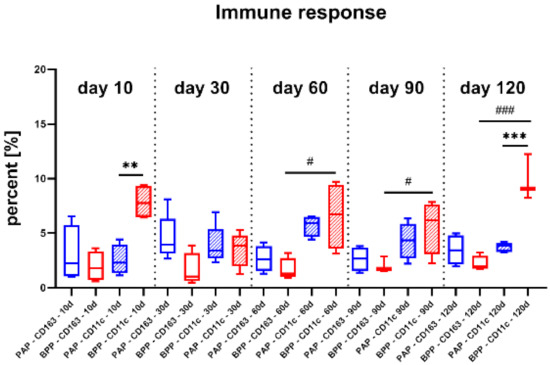 Figure 8. Results of the histomorphometrical analysis of the occurrence of pro- and anti-inflammatory cells (* = interindividual significances, # = intraindividual significances, # p < 0.05, ** = p < 0.01, ***/### p < 0.001). PAP: porcine aortic patch, BPP: bovine pericardial patch, blue: PAP-CD163, red: BPP-CD163, blue patterned: PAP-CD11c, red patterned: BPP-CD11c.