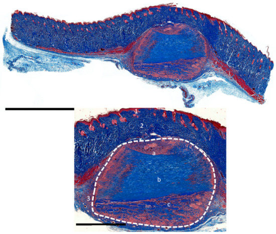 Figure 9. Cross-sectional overview and closeups of the subcutaneous implantation model of the porcine aortal patch (PAP). Dashed line: implant, 1: epidermis, 2: dermis, 3: subcutaneous layer, a: tunica intima, b: tunica media, and c: tunica adventitia. (Images were stained with Azan, magnification: 20× and scale bars = 5 mm (overview) and 2 mm (magnified)).