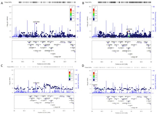 LocusZoom plot of genetic association at locus 12p11.21. (A) Association plot of all SNPs genotyped in GWAS db1 at the 12p11.21 locus. There are 60 genes at this locus. (B) LocusZoom plot of all SNPs genotyped in GWAS db2 at the 12p11.21 locus. (C) OASIS analysis identified the most significant SNPs in 20 kb window size which were plotted for db3 using LocusZoom. (D) Plot of the most significant SNPs in db4.