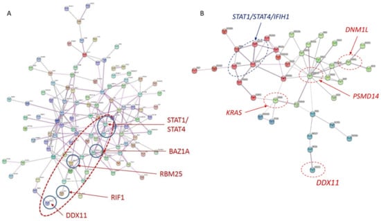 Protein network analysis using STRING of 187 genes (Table S2) showed a complex interaction network. DDX11 interacted indirectly with several genes found to be significant in OASIS loci and GEO datasets. DDX11 interaction with STAT1/STAT4 was mediated via RIF1, RBM25 and then BAZ1A (Figure 3A). Interestingly, the remaining 132 genes included several known SLE genes such as IRF5, BLK, TNIP1 and CD44; however, these genes were either significant in a single GEO dataset only or did not have uniform expression. STRING analysis provided further supportive evidence that DDX11 is potentially involved in SLE pathobiology.