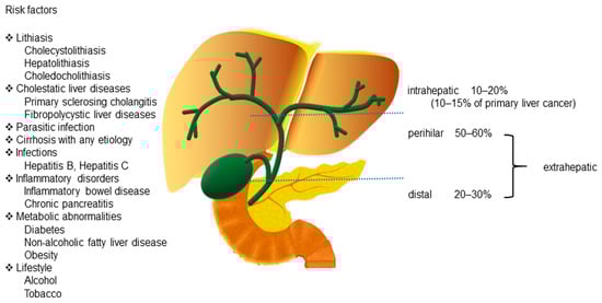 Although the occurrence and etiology of CCA have not been determined, there are several well-established risk factors associated with chronic biliary epithelium inflammation and cholestasis. These include lithiasis []; cholestatic liver diseases, such as primary sclerosing cholangitis (PSC) [] and fibropolycystic liver diseases []; parasitic infections by Opisthorchis viverrini, Clonorchis sinensis, and Schistosomiasis japonica [,]; cirrhosis with any etiology []; infections, such as hepatitis [,]; inflammatory disorders, such as inflammatory bowel disease (IBD) [] and chronic pancreatitis []; metabolic abnormalities [,]; and lifestyle [,] (Figure 1).