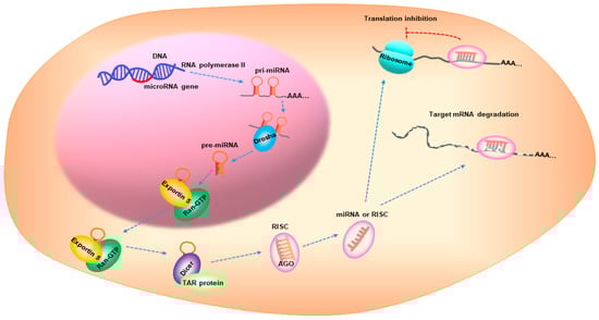 MicroRNAs (miRNAs) are small, non-coding RNAs with a 17–25 nucleotide length []. miRNA biogenesis is a multistep process that is categorized into: transcription, nuclear cropping, export to cytoplasm, and cytoplasmic dicing []. miRNA genes are transcribed as primary RNA (pri-miRNA) by RNA polymerase II (pol-II) and are processed by Drosha, a nuclear enzyme of the RNase III family, in the nucleus to release a hairpin-shaped precursor called “pre-miRNA”. Pre-miRNA is recognized by Exportin 5/Ran-GTP transporter and is exported from the nucleus to the cytoplasm. The pre-miRNA is then cleaved by Dicer and the TAR RNA-binding protein to produce a miRNA duplex, which is then loaded onto the Argonaute (AGO) protein to assemble the RNA-induced silencing complex (RISC). One strand remains on the AGO protein to form the mature miRNA, while the other strand is degraded. The mature miRNA represses gene expression by interacting with the complementary sequences in the 3′-untranslated region of the target mRNAs [,,] (Figure 2). Over 5000 miRNAs from diverse organisms are registered in online databases, such as the miRBase (www.mirbase.org, accessed on 9 May 2021). In humans, approximately one-third of the miRNAs are organized in clusters and contain two or more miRNAs with similar sequences [], possibly leading to combinatorial diversity and synergy in the biological effects of the miRNAs. Furthermore, approximately 30% of the human genes are regulated by miRNAs via signaling pathways [].