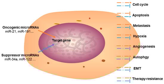 In recent decades, several studies have focused on the role of miRNAs in cancers. miRNAs play a key role in cancer cell regulation, and are associated with the progression of the cell cycle, apoptosis, metastasis, angiogenesis, glycolysis/Warburg effect, autophagy, therapy resistance, and epithelial–mesenchymal transition (EMT).