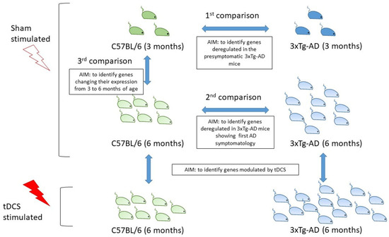 As reported in Figure 1, the main aim of this study is to further characterize the blood transcriptome profile of the 3xTg-AD mouse by analyzing mice at three and six months of age, in order to identify peripheral biomarkers of AD progression and prognosis. In particular, we studied the expression profile of pre-symptomatic three-month-old mice and of symptomatic six-month-old mice compared to age-matched control mice (C57BL/6); in this way, we could better analyze which genes and pathways are modulated by the 3xTg-AD mice’s genetic background and which are modulated by age and the onset of AD symptomatology. To assess if gene expression changes in blood can also be exploited to study the brain response to external stimulation, we also analyzed the transcriptome profile of mice that underwent anodal transcranial Direct Current Stimulation (tDCS). tDCS is a noninvasive brain stimulation technique that is able to modulate cortical excitability through the release of a weak electrical current. In particular, anodal stimulation is known to depolarize neurons, to increase the probability of action potentials occurring and to induce synaptic plasticity [16,17,18]. The effects of tDCS on brain gene expression have been previously assessed in different animal models, revealing its ability to modulate the expression of genes involved in the mechanisms of synaptic plasticity and neuronal activity [19,20,21,22]; however, to date no studies have investigated its effects at the blood level.