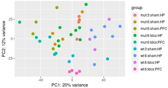 The gene expression analysis was performed using the DESeq2 package in R, as described in [85]. Principal Component Analysis (PCA) was performed with prcomp package on DESeq2 log-transformed data in R [85]. Within the expression dataset, we identified 6 sample groups stratified by mouse strain, age and treatment as defined in Table 1. First, we analyzed the specific transcription profile of the 3xTg-AD mouse strain by comparing mice in the sham group according to the following contrasts: (i) three 3-month-old (3 mo.) 3xTg-AD mice vs. three 3 mo. WT mice; (ii) nine 6-month-old (6 mo.) 3xTg-AD mice vs. six 6 mo. WT mice; (iii) six 6 mo. vs. three 3 mo. WT mice (Figure 1). Differentially expressed genes (DEGs) were identified using the Likelihood Ratio Test (LRT) as implemented in DESeq2 comparing a reduced model including “RIN” and “site of stimulation” variables with a full model including RIN “site of stimulation” and group variables. “Site of stimulation” was included as covariate in the comparison of mice that underwent sham stimulation due to its strong correlation with the first principal component. We then investigated the effect of tDCS on transcription profiles of 6 mo. mice according to the following contrasts: (i) fourteen 3xTg-AD mice undergoing tDCS stimulation vs. nine 3xTg-AD mice undergoing sham stimulation; (ii) seven WT mice undergoing tDCS stimulation vs. six WT mice undergoing sham stimulation (Figure 1).