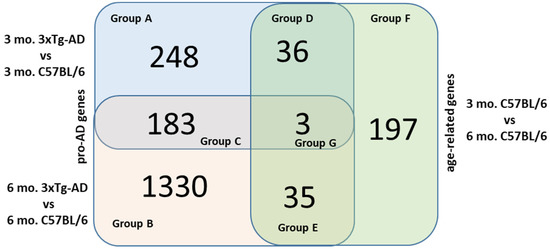 To complete the analysis and evaluate how the expression profile changes during the mouse physiological growth, we compared C57BL/6 mice at three and six months of age (third comparison), and we identified 271 DEGs. Among these, 36 genes (Group D) resulted in being differentially expressed also in the comparison of 3 mo. 3xTg-AD vs. 3 mo. C57BL/6 mice, and their expression changes were concordant, i.e., all up-regulated genes in 3 mo. 3xTg-AD were also up-regulated in 6 mo. C57BL/6 mice (and down-regulated genes as well). These observations suggest that, in the blood of the 3 mo. 3xTg-AD mice, there are genes whose expression is more similar to that of a 6 mo. mouse rather than that of a 3 mo. one. Our findings are in line with those presented by Gatta et al., where the authors proposed a set of genes whose expression is modulated by age as a major contributing factor in AD [14]. Indeed, Gatta et al. have previously suggested an alteration in the expression of genes related to aging in 3 mo. 3xTg-AD mice; in particular, they observed an altered expression of genes related to mitochondrial functioning, inflammatory response and calcium homeostasis, in neuronal proliferation, synaptic plasticity and neuronal survival. Among age-related genes that are down-regulated in 3 mo. 3xTg-AD mice, we observed an enrichment of genes involved in the response to the AMP cyclical (cAMP) pathway. In particular, all of the four genes in this pathway were related to apoptosis and cell proliferation: three genes (Fos, Fosb, Junb) encode for subunits of the transcription factor complex AP-1, important regulators of cell proliferation, differentiation, transformation and apoptosis; the fourth, Dusp1, whose expression is controlled by the AP-1 complex, is a negative regulator of cell proliferation. Cell proliferation, apoptosis and senescence, fundamental for the maintenance of brain tissue homeostasis, are altered in the brains of AD patients, and they are supposed to be involved in the development and progression of the disease [62,63,64]. Despite neurons being known to be typically in a quiescent state in the adult nervous system, cell cycle reactivation was observed in neurodegenerative diseases [64,65] as a consequence of mitotic stimuli, such as the presence of beta amyloid plaques and tau tangles [66]. Despite the expression of proteins involved in the cell cycle, this cannot be typically concluded by neurons and it leads to neuronal apoptosis [67], another mechanism impaired in AD [68,69]. In accordance with our results, the overexpression of several cell cycle proteins was also observed in peripheral lymphocytes of AD patients [70].