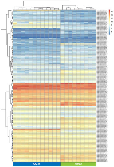 In this group, there are genes that are deregulated both in the first and second comparisons and likely represent genes that are constitutively deregulated in the 3xTg-AD strain compared to the WT one, independently of age and presence of the AD symptomatology. Thus, we can assume that gene expression differences seen for these genes are directly influenced by the different genetic background of the strains analyzed. In this group, we observed 183 genes (Figure 3), a number 3.99-fold higher than expected by chance (randomized test p < 1 × 10−5). The list of these genes is reported in Supplementary Table S1. Intriguingly, we noted that the log2 fold-change values resulting from the two comparisons for these genes are strongly positively correlated (r2 = 0.92), implying that gene expression is similarly modulated in 3 mo. 3xTg-AD mice and 6 mo. 3xTg-AD mice, compared to WT mice of the same age. As depicted in the Heatmap (Figure 4), among these genes, some were expressed at a moderate/high level in the 3xTg-AD mice, and not expressed, or expressed at a very low level, in WT mice.