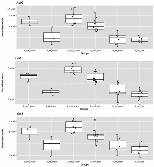 Four of these DEGs (Ap1b1, Ogdh, Rnf123 and Mical3) were also present in Group B, and three (Crat, Ybx3, Ago2) were included in Group C. For these three genes, Boxplots (Figure 5) revealed that mice stimulated with tDCS show a level of expression that approximate to that of WT sham mice. No gene groups resulted in being significantly enriched from gene-set enrichment analysis.