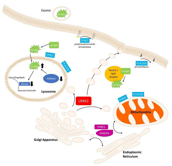 Both α-synuclein localization and aggregation are dependent on specific membrane lipid composition. Moreover, lipid metabolism alteration in lysosomes for instance by GBA or SMPD1 mutants may affect the α-synuclein clearance. LRRK2 may regulate lipid metabolism either directly or, more likely, indirectly through the control of vesicle trafficking by the phosphorylation of different RAB family proteins. Eukaryotic cells rely on a complex and regulated network of vesicular transport to ensure efficient delivery of lipids to target organelles. Moreover, the endogenous lipid synthesis and delivery is of particular relevance in neurons because some circulating plasma lipids (e.g., cholesterol) cannot reach these cells due to the inability of different lipoproteins to traverse the blood–brain barrier. SYNJ1 is a polyphosphoinositide phosphatase acting on various phosphoinositides, and PLA2G6 is a calcium-independent group VI phospholipase A2; therefore. both are directly involved in the control of lipid metabolism. SYNJ1 and PLA2G6 are both localized on neuronal mitochondria, endosomal and lysosomal membranes, and plasma membrane and could play an essential role in remodeling membrane phospholipids either in cellular organelles or in axons and synapses. Importantly, the biogenesis and architecture of different cell structures (mitochondria, lysosomes, vesicles or lipid droplets, cell membranes) are largely dependent on the lipid composition. Furthermore, products generated by SYNJ1 or PLA2G6 are important second messengers that play relevant roles in different signal transduction pathways in neurons. Recent evidence has highlighted specific alteration in mitochondria due to abnormal lipid trafficking from the endoplasmic reticulum in both human hypothalamic neurons and fruit fly models lacking parkin or pink-1 genes. These data are further corroborated by specific alterations in lipid metabolism/composition in different PARKIN or PINK1 experimental models. Finally, experimental results indicating that LBs are largely composed of lipids, membrane fragments, and membranous organelles, such as vesicles, further confirm the importance of lipid composition in PD pathology.