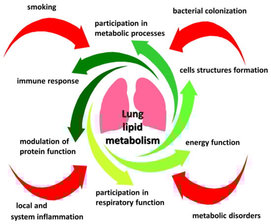 Lipids play an important role in providing lung function. They perform not only a structural or energy function but also act as participants in many processes [,]. The lipid metabolism in the lungs is extremely complex, characterized by the participation of many types of lipids, and has specific features characteristic of different cell types. Some cells may even have their own characteristics of lipid metabolism associated with their differentiation and functional activity [,]. This complexly maintained lipid homeostasis of the lungs participates in providing an immune response and regulating inflammation.