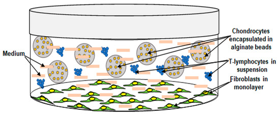 To better understand the underlying paracellular interactions between different cells in the pathophysiology of osteoarthritis (OA) and to address the detailed mechanisms during OA in the joint, we created a new osteoarthritic multicellular environment model (Figure 1) consisting of fibroblasts, T-lymphocytes, and 3D-alginate with chondrocytes to better mimic the heterogeneous pro-inflammatory OA-EN in vivo. In the present study, we investigated whether curcumin has the necessary properties to block OA-EN-promoted inflammation in chondrocytes and degradation of ECM by modulating the pro-inflammatory NF-kB transcription factor signaling pathway, as well as the cartilage-specific transcription factor Sox9 signaling pathway, as these are poorly understood.
