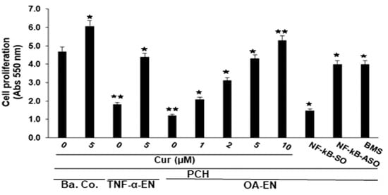 To investigate the pathological significance of the OA-EN state on chondrocyte viability and proliferation, we first examined the proliferative capacity of chondrocytes in alginate cultures by themselves (Ba. Co.), as well as in co-culture using fibroblasts with TNF-α (TNF-α-EN) or in co-culture with fibroblasts and T-lymphocytes (OA-EN) with and without curcumin treatment as control (Figure 1) and analyzed cell proliferation via MTT method according to the instructions given in the chapter Materials and Methods. To highlight the fact that TNF-α may be considered as one of the key pro-inflammatory cytokines produced by leukocytes, we also performed a comparative experiment with TNF-α alone (TNF-α-EN) in parallel experiments with lymphocytes. As shown in Figure 2, OA-EN with T-lymphocytes or with TNF-α alone significantly inhibited chondrocyte viability and proliferation compared with basal control. Interestingly, in contrast, co-treatment of OA-EN or TNF-α-EN cultures with curcumin showed protective, dose-dependent effects on chondrocytes, resulting in chondrocyte proliferation (Figure 2). Collectively, all these results point to the fact that curcumin indeed has superior anti-inflammatory potency in an OA-EN in vitro. Given that NF-kB is involved in both the inflammatory microenvironment and cellular apoptosis in chondrocytes [26], we further investigated the effect of SO, ASO toward NF-kB or BMS-345541, which is a highly selective IKK component complex blocker and may be capable of specific suppression of NF-kB generation prompted via various types of excitation [27,28] on chondrocyte survival and multiplication via MTT assay, as outlined under Materials and Methods. Treatment of chondrocyte-alginate cultures in the OA-EN with NF-kB-SO significantly downregulated chondrocyte survival and proliferation in a manner similar to the OA-EN itself. Nevertheless, when chondrocyte-alginate cultures were transfected with NF-kB-ASO by itself in the OA-EN, increased proliferation of chondrocytes was seen, resembling that observed in the curcumin-treated OA-EN (Figure 2). Collectively, these lines of available evidence suggest the possibility that TNF-α, analogous to OA-EN, is capable of suppressing chondrocyte survival and proliferation, thus promoting the process by which OA occurs. Curcumin’s specific and targeting suppression of this pro-inflammatory pathway in the OA-EN, similar to the knockdown of NF-kB at the mRNA level by ASO-NF-kB, as well as at the IKK pathway using BMS-345541, is definitely, at least in part, dependent on the NF-kB protein.