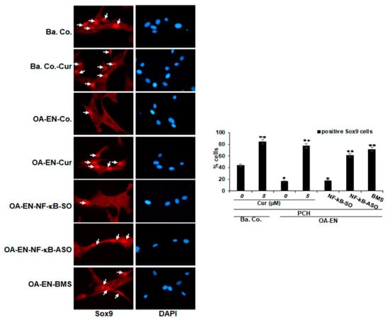 We next investigated whether the protective and stimulatory effects of curcumin in chondrocytes in OA-EN are mediated by blocking NF-kB and triggering the chondrogenic transcription factor Sox9. Chondrocytes in OA-EN cultures had been handled as outlined under Materials and Methods, following which immunofluorescence staining for Sox9 was done. Basal reference cultures exhibited intensive nuclear fluorescent labeling of Sox9 in chondrocytes (Figure 3), and this labeling was enhanced in the presence of curcumin. In the untreated or in with NF-kB-SO transfected OA-EN cultures, chondrocytes showed markedly lower expression of Sox9. However, pretreatment with curcumin, similar to NF-kB-ASO or BMS-345541, led to a distinct overexpression of Sox9 levels present in chondrocytes (Figure 3). Overall, these outcomes propose that stimulatory effects on specific chondrogenic transcription factor Sox9 by curcumin in the OA-EN, similar to NF-kB-ASO or BMS-345541, are mediated in chondrocytes, which is at least partly through inhibition of the NF-kB regulatory signaling pathway. Furthermore, there is a molecular link between the NF-kB protein and the Sox9 protein.