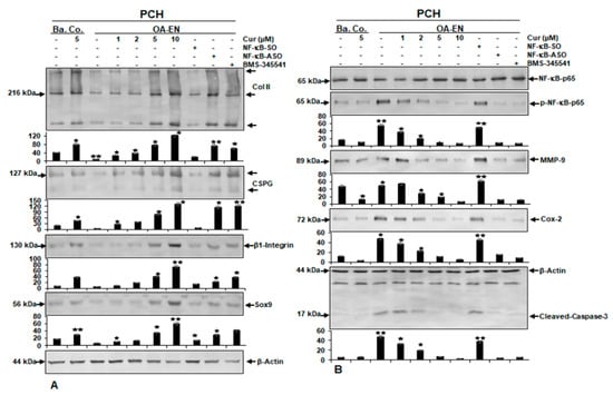 Influence of curcumin, ASO against NF-kB, BMS-345541 upon extracellular matrix, β1-integrin, Sox9, NF-kB, NF-kB-promoted pro-inflammatory, matrix-degrading, and apoptotic proteins on chondrocytes in the osteoarthritic environment. Panel A-B: Serum-depleted chondrocytes (PCH) in alginate cultures by themselves (Ba. Co.) were kept nontreated or treated with curcumin (Cur), or co-cultured with fibroblasts and T-lymphocytes (OA-EN) and kept nontreated or treated with different doses of curcumin, or transfected with NF-kB-SO or NF-kB-ASO or treated with BMS-345541 for 14 days as outlined in Materials and Methods. Total cell samples were obtained, separated via SDS-PAGE, and subjected to western blot assay with antibodies against panel A: Collagen II, CSPG, β1-integrin, Sox9 panel B: NF-kB, phospho-NF-kB, MMP-9, Cox-2, and activated Caspase-3. β-Actin served as a loading control in each assay. Bars represent the mean values for each antibody along with standard variations of at least three separate experiments. Data were compared to the control. Statistically meaningful levels of p < 0.05 are marked with (★) and p < 0.01 with (★★).