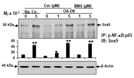 In this report, we showed that NF-kB and NF-kB-stimulated end proteins provoked by OA-EN correlate with a significant reduction of the chondrogenic transcription factor Sox9 and cartilage-specific matrix proteins, demonstrating that both transcription factors act in tandem during OA-EN in chondrocytes. Therefore, to investigate the possible functional association of NF-kB and Sox9 during OA-EN of chondrocytes in alginate cultures, we ran a co-immunoprecipitation assay. OA-EN cultures have been kept untreated or handled as outlined in the Materials and Methods chapter. Additionally, chondrocytes grown solely in the alginate were used as basal controls. Cell samples had been immunoprecipitated using antibodies directed to p65-NF-kB, which was subsequently subjected to immunoblotting by Sox9 antibodies. Interestingly, as shown in Figure 5, in both chondrocytes in basal control and in OA-EN-treated cultures with curcumin, similar to BMS-345541, we found an apparent strong co-immunoprecipitation of p65-NF-kB protein with Sox9 in a dose-dependent fashion (Figure 5). Marginal co-immunoprecipitation of p65-NF-kB protein with Sox9 protein was observed in untreated control cultures (Figure 5). Collectively, this finding further points to the fact that curcumin stimulates the accumulation of Sox9 protein and causes the formation of the Sox9-p65-NF-kB complex in chondrocytes exposed to OA-EN, which activates the chondrogenic differentiation pathway, suggesting that this pathway may be a major part of the anti-osteoarthritic mechanisms of curcumin through Sox9 activation and thereby modulation of the NF-kB pathway.