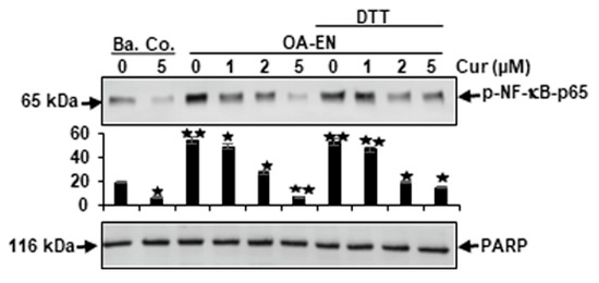 Influence of curcumin on direct association of the p-NF-kB-p65 on DNA in chondrocytes grown in OA-EN. Serum-starved chondrocytes in alginate cultures of OA-EN were handled as outlined in Materials and Methods. Results presented of a minimum of three independent assays, and PARP, a housekeeping protein, was used as a loading control. The densitometric assay was applied to p65-NF-kB. ★ p < 0.05, ★★ p < 0.01.
