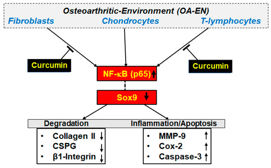 Here, using an in vivo-like OA-EN model, we demonstrate that curcumin down-modulates the activation of NF-kB and NF-kB-promoted proteins participating in inflammatory and destructive processes of cartilage while upregulating Sox9. These results suggest that curcumin, as a natural multi-targeting component that plays a basal anti-inflammatory role in the inflamed joint, represents a novel therapeutic approach to treat inflammation in OA.