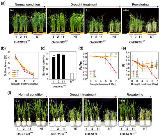 Overexpression of OsERF83 in rice confers drought tolerance. (a) Drought tolerance phenotypes of OsERF83 overexpression (OsERF83OX) transgenic plants (lines 1, 2, 11). The 5-week-old plants (0 d) were exposed to drought by withholding water for 2 days and rewatering for 8 days. (b) Measurement of soil moisture content (%). Error bars represent the means ± SD (n = 10). (c) The survival rate of the transgenic plants, scored 8 days after rewatering. (d,e) Determination of the photosynthetic viability of transgenic and NT plants under drought conditions. At the indicated time point after exposure to drought stresses, the chlorophyll fluorescence (Fv/Fm) (d) and performance index (PI) (e) of overexpression plants and NT plants were measured. The data represent the mean ± SD (n = 10 points per independent line of each genotype). (f) Drought tolerance phenotypes of OsERF83OX transgenic plants (lines 1, 2, 11) in big pots. The 6-week-old plants (0 d) were exposed to drought by withholding water for 7 days and rewatering for 8 days. Asterisks (**) indicate statistically significant differences compared with non-transgenic (NT) plants according to a Student’s t-test ** p < 0.001).