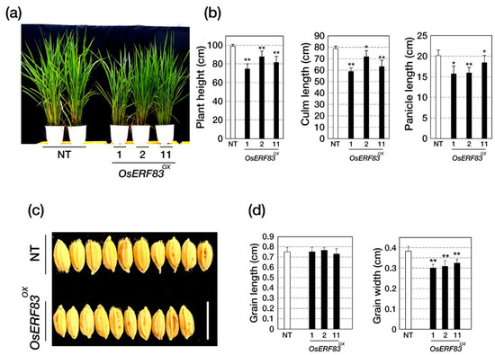 The OsERF83OX plants showed smaller plant height, including culm length and panicle length at all stages (Figure 3a,b). At the maturity stage, the average plant height of NT, OsERF83OX #1, OsERF83OX #2, and OsERF83OX #11 was 98.86 cm (100%), 75.50 cm (76.4%), 87.63 cm (87.6%), and 81.50 cm (81.5%), respectively (Figure 3b, Table S1). The yield component values of the OsERF83OX plants, such as the number of spikelets per panicle (NSP), the number of total spikelets (NTS), the number of filled grains (NFG), the grain-filling rate (FR), and total grain weight (TGW), were reduced compared to the NT plants (Figure S5, Table S1). Moreover, the OsERF83OX plants showed shorter grain width than the NT plants (Figure 3c,d). Collectively, these results indicate that overexpression of OsERF83 affects plant growth and grain yield negatively in rice.