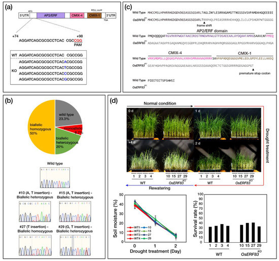 For the loss-of-function study analysis, knock-out (OsERF83KO) mutants were generated using a clustered regularly interspaced short palindromic repeats/recombinant codon-optimized Cas9 (CRISPR/Cas9) genome editing system (Figure S1c) [26], with which various types of induced mutations were found. The single-guide RNA (sgRNA) target sites were designed at the upstream region of the AP2/ERF domain for generating mutants edited in OsERF83 specific regions (Figure 4a). Four types of mutants containing 1 bp insertions were generated at the same upstream position of the PAM sequence (Figure 4a,b). Sequencing analysis revealed mutation patterns in transgenic plants, including frameshifts and premature stop codons (Figure 4c). Among 30 independent transgenic plants, 23.3% were null, and 20% were biallelic heterozygous mutant plants. A further 50% were biallelic homozygous, and we selected four independent OsERF83KO mutants for further study (Figure 4b).