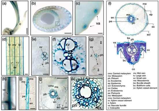 As shown in Figure 1b, OsERF83 was expressed ubiquitously in all the examined tissues, with high expression levels in roots. To further explore the function of OsERF83 in drought tolerance, we investigated the tissue expression pattern of OsERF83 using histochemical GUS staining with Paraplast section. We generated transgenic rice plants with a β-glucuronidase (GUS) reporter gene, driven by the native OsERF83 promoter (OsERF83::GUS) (Figure S1d). We used a coleoptile, stem, leaves, and roots of plants, as exhibited in Figure 5a–k. Interestingly, the strong GUS signals were consistently detected in vascular tissues of the coleoptile (Figure 5a), stem (Figure 5b,c), leaves (Figure 5d–g), and roots (Figure 5h–k), as shown in the longitudinal section of the roots (Figure 5i), despite the difference in developmental stage and organs. These data indicated that OsERF83 was a constitutively expressed gene and was involved in the vascular tissues.