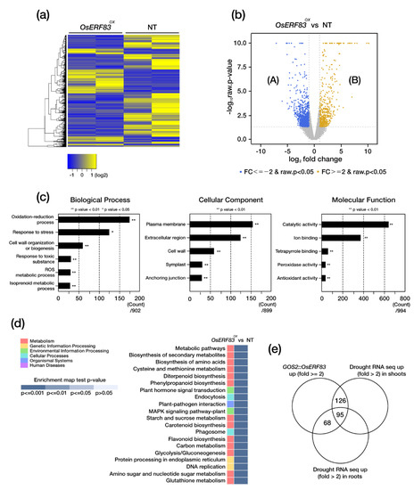 RNA-seq analysis using leaves of OsERF83-MYCOX plants. (a) Heat map analysis of differentially expressed genes (DEGs) between OsERF83-MYCOX and NT plants. (b) Venn diagram of the numbers of up- and down-regulated DEGs in OsERF83-MYCOX plants compared to NT plants. (c) Gene ontology (GO) enrichment analysis of DEGs between OsERF83-MYCOX and NT plants. The most enriched GO term is shown in ‘biological process’, ‘molecular function’, and ‘cellular component’. Asterisks indicate significant enriched GO terms (** p < 0.01, * p < 0.05). (d) KEGG pathway enrichment analysis of DEGs. (e) Venn diagram of up-regulated genes amongst the DEGs identified in OsERF83-MYCOX and DEGs identified in drought-treated NT shoots and roots from public data (TENOR: http://tenor.dna.affrc.go.jp/, accessed on 30 November 2020).