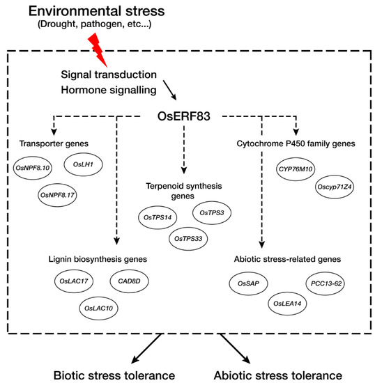 Schematic representation of OsERF83-mediated stress tolerance. The rice recognizes the stress signal through a plant hormone signaling pathway, and OsERF83 is up-regulated in response to stresses. Transporter genes (OsNPF.10, OsLH1, OsNPF8.17), terpenoid synthesis genes (OsTPS14, OsTPS33, OsTPS3), cytochrome P450 genes (Oscyp71Z4, CYP76M10), lignin biosynthesis genes (OsLAC17, OsLAC10, CAD8D), and abiotic stress-related genes (OsSAP, OsLEA14, PCC13-62) were induced by OsERF83.