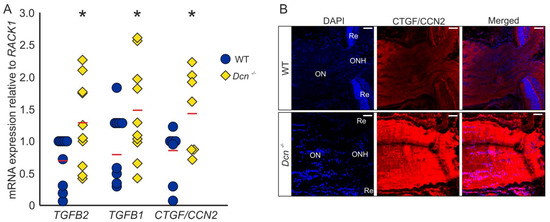 We previously reported that the absence of DCN leads to a glaucomatous phenotype in mice, with an increased expression of growth factors and ECM components in the region of the trabecular meshwork (TM) [32]. Analysis of mRNA levels of ONs obtained from DCN-deficient mice and their wildtype (WT) littermates revealed an upregulation of TGF-β2 (WT = 1 ± 0.13, n = 9, Dcn−/− = 1.85 ± 0.23, n = 10, p = 0.036), TGF-β1 (WT = 1 ± 0.15, n = 9, Dcn−/− = 1.83 ± 0.23, n = 10, p = 0.040) as well as CTGF/CCN2 (WT = 1 ± 0.15, n = 7, Dcn−/− = 1.84 ± 0.23, n = 7, p = 0.044) (Figure 1A). Immunofluorescence staining against CTGF/CCN2 in sagittal sections through the ON underscored these findings, showing a substantially stronger signal for CTGF/CCN2 in DCN-deficient animals (Figure 1B).