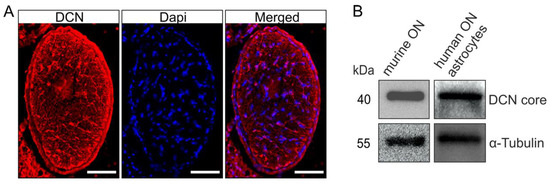Immunofluorescence staining against DCN in cross sections through murine ONs revealed the presence of DCN (Figure 2A), with a unique distribution pattern, most prominent in distinct processes of the ON astrocytes [43]. The finding that astrocytes are the main source of DCN production in the ON was further corroborated by Western blot analysis using protein extracts from murine ONs. In the protein extracts of cultured human ONH astrocytes we also found a positive signal for DCN in the Western blot analysis (Figure 2B), showing that the DCN expression and synthesis by astrocytes is found throughout the species.